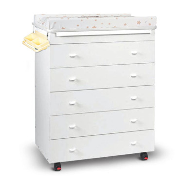 Mobile bagnetto/fasciatoio completamente in legno, è dotato di 5 ampi cassetti e un portaoggetti asportabile con porta-salvietta, cuscino e 4 ruote.