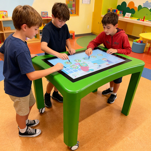 Sul piano superiore è incassato uno schermo touch screen da 32" multi-tocco che consente l'attività contemporanea di più utenti, facilitando così la collaborazione, la socializzazione e il lavoro di gruppo.